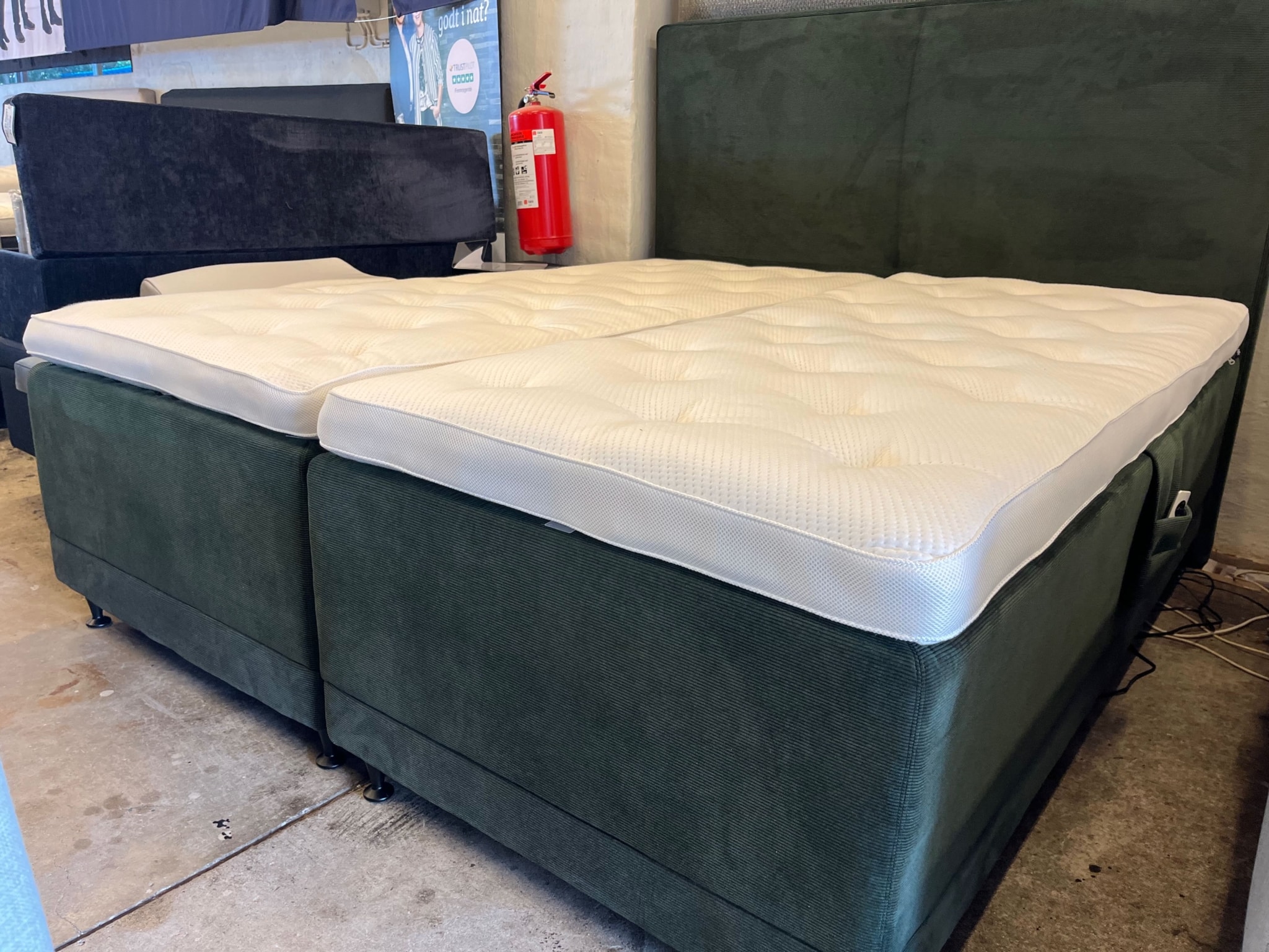 Som topmadras kan du vælge to enkelte topmadrasser som vist på billedet eller én stor topmadras som er med et split, så den fungerer på elevation.