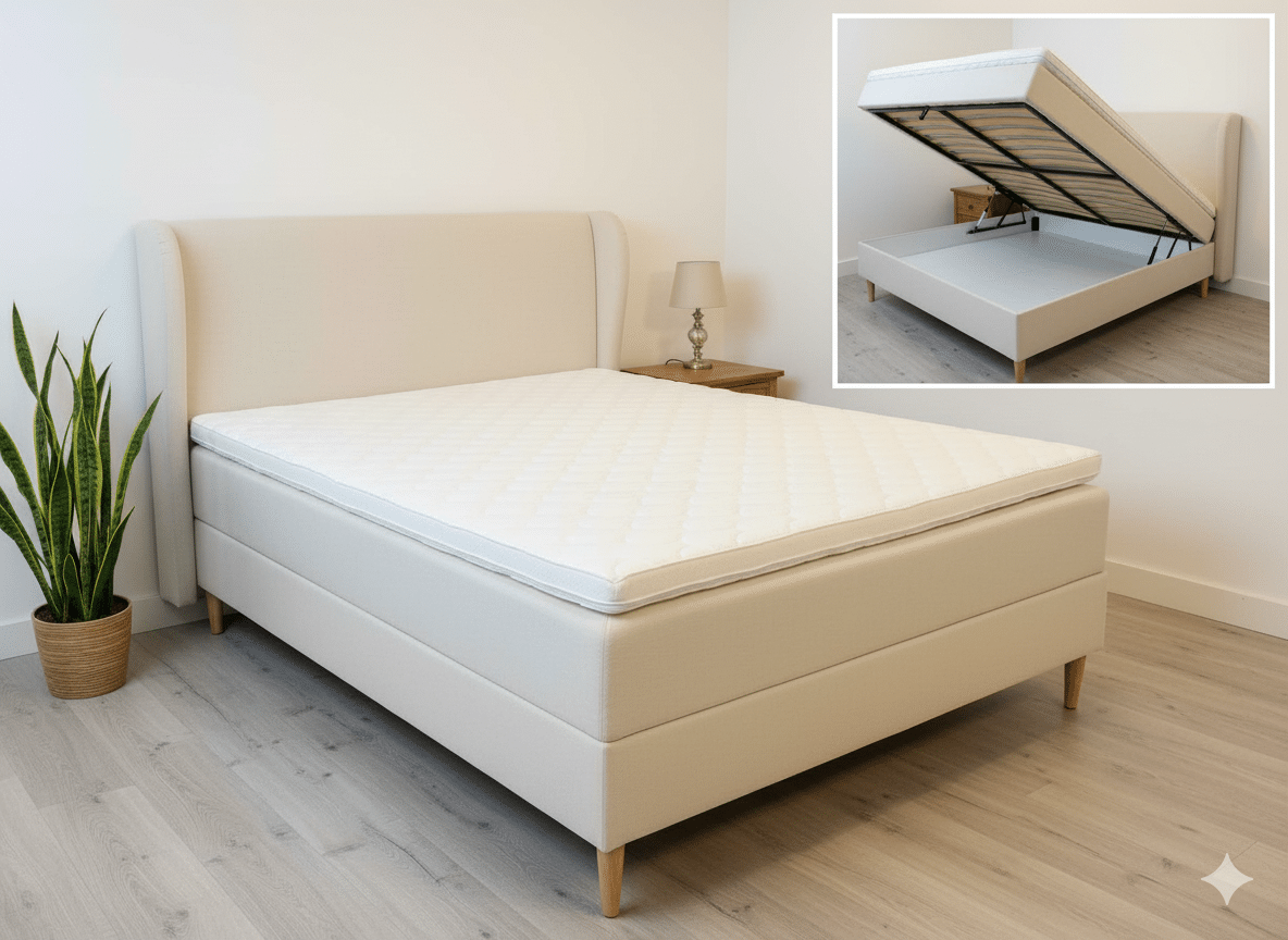 Boxmadras med opbevaring 140×200 cm sandfarvet