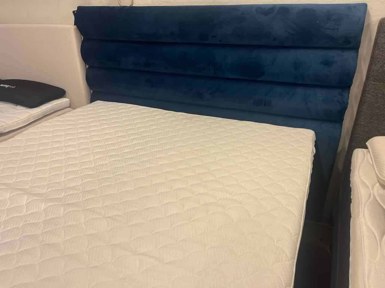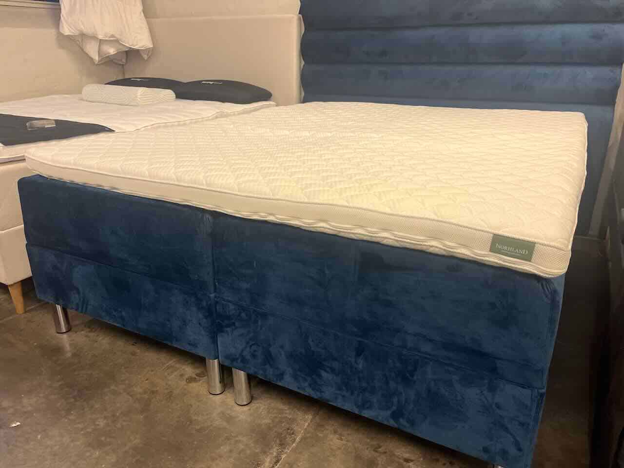 Kongeblå velour seng med virkelig god komfort, samtid med at du har stor sengemagasin i begge senge – perfekt til det lille soveværelse.