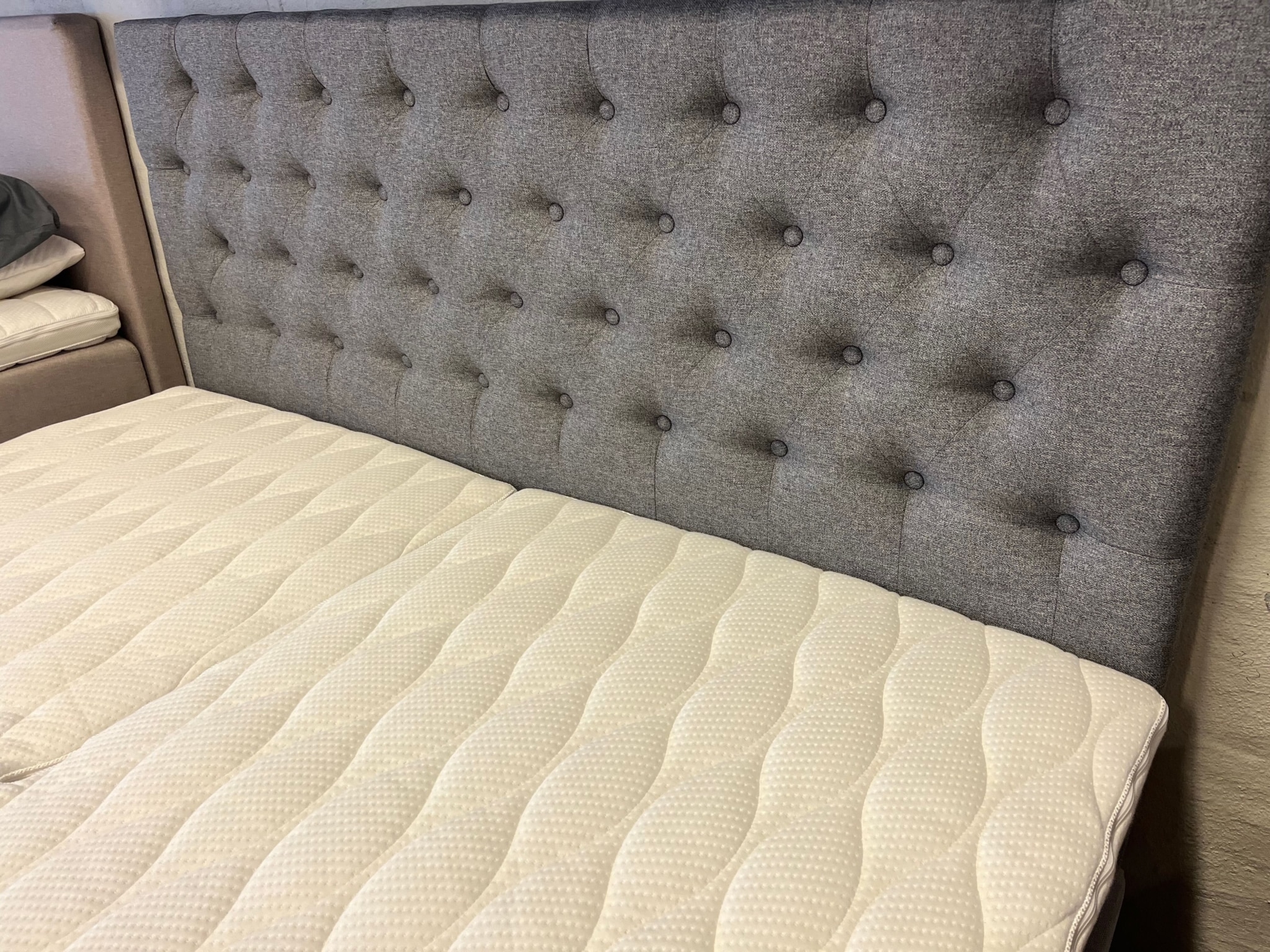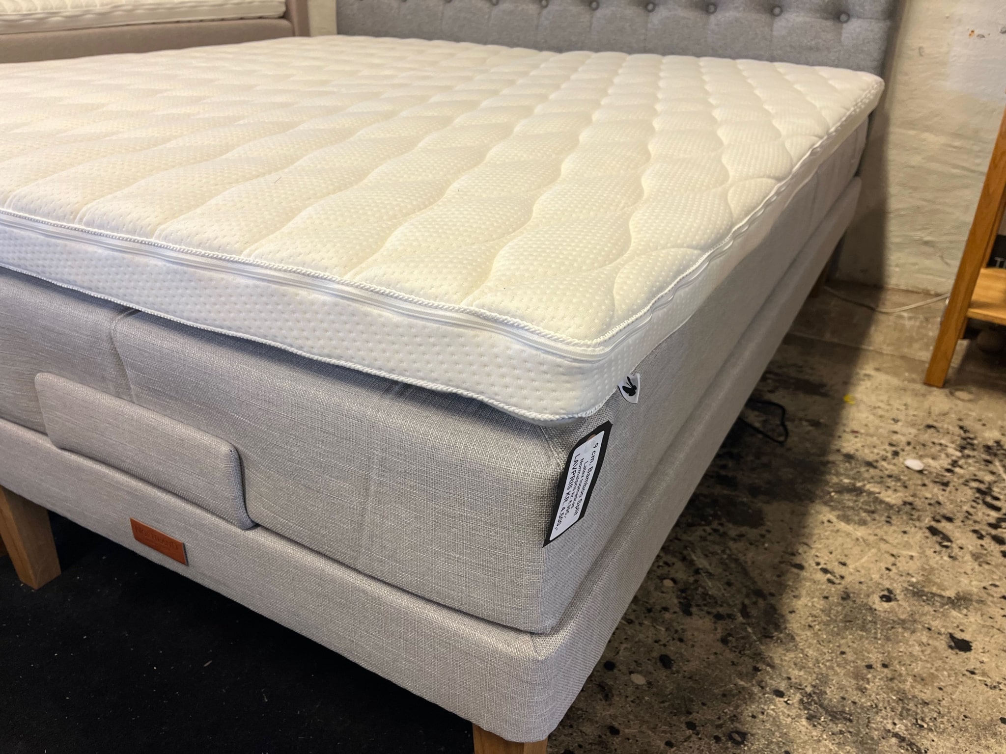 Elevationsseng i lysegrå med super lækker topmadras