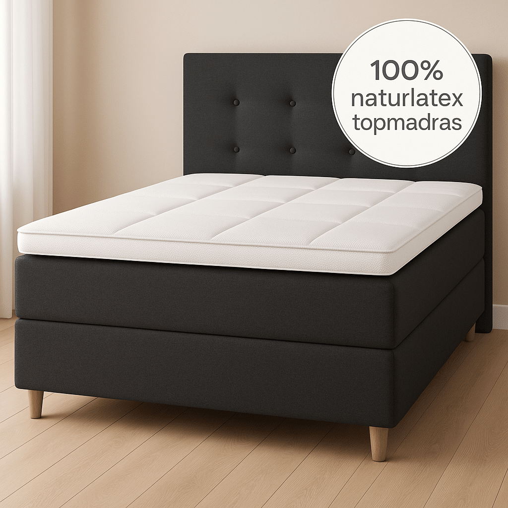 Øverst fuldendes konstruktionen af en 8 cm tyk topmadras med 100% naturlatex, som sikrer fremragende ventilation, naturlig temperaturregulering og en blød, men støttende liggeflade. Latexens elasticitet betyder, at madrassen former sig præcist efter kroppen og giver ideel støtte nat efter nat.