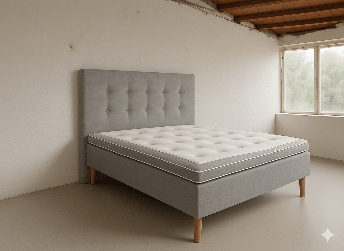Kraftige Boxmadras Særtilbud, 120 el.140 x 200, med 10 cm. tyk topmadras – Fås i farverne Sort, Sandfarvet, eller som her lysegrå.