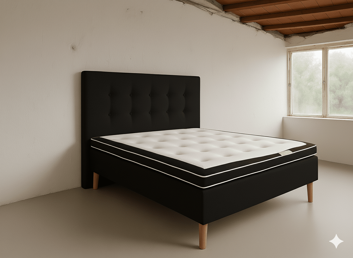 Kraftige Boxmadras Særtilbud, 120 el.140 x 200, med 10 cm. tyk topmadras – Fås i farverne Sandfarvet, Lysegrå, eller som her Sort.